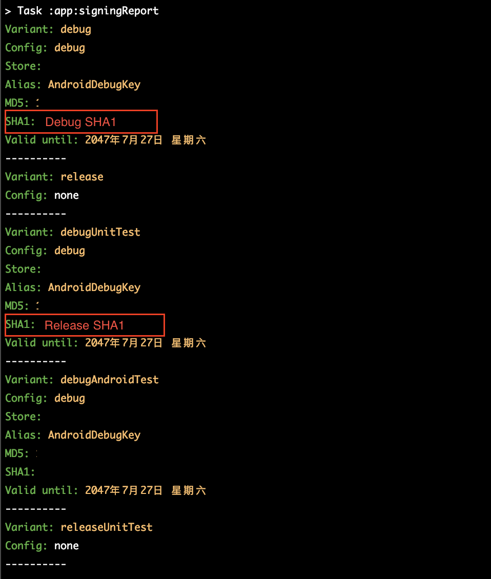 Android应用,分为调试签名版本(debug)和发布签名版本(release),他们的 SHA1 值不同,需要根据需要选择。