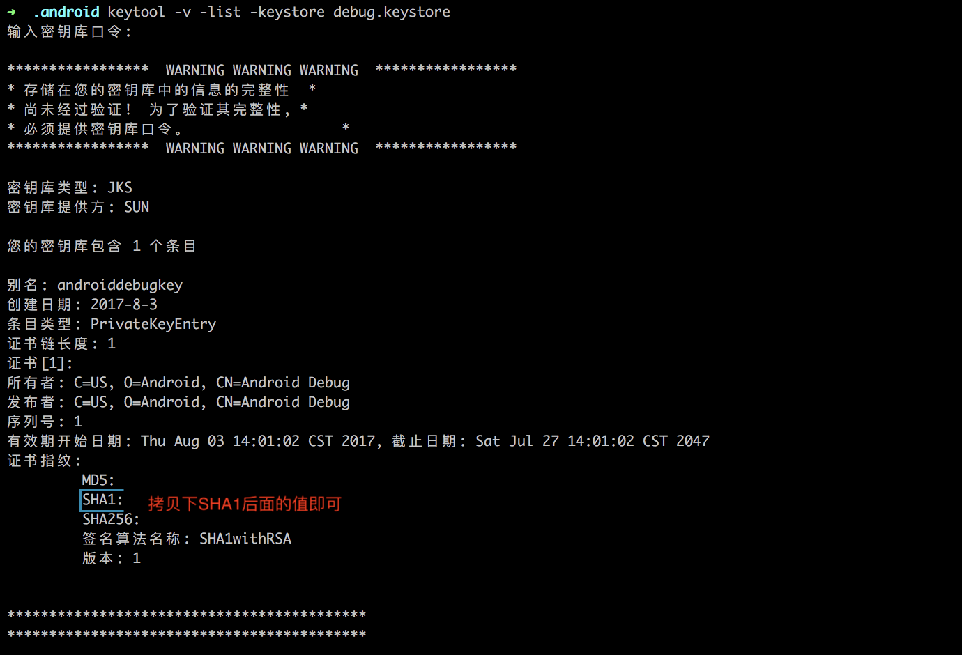 - 输入密钥后回车确认(若没设置密码,可直接回车),此时可在显示的信息中获取 SHA1 的值。
