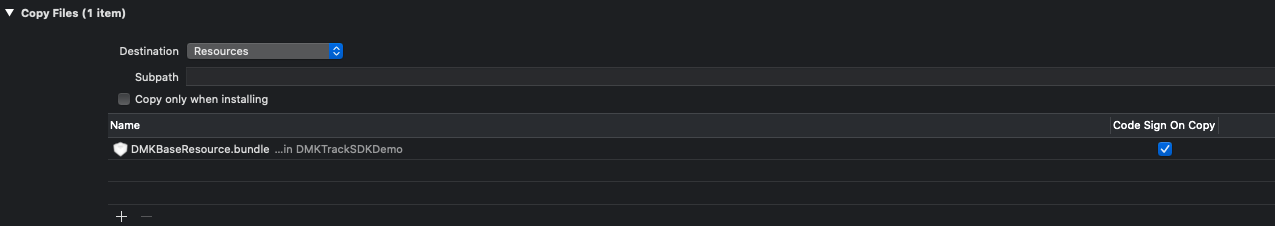 从DMKBaseSDK.framework目录下取出DMKBaseResource.bundle资源包. 在TARGETS->Build Phases-> Copy Files 中点击“+”按钮,将DMKBaseResource.bundle 添加到工程.如下图: