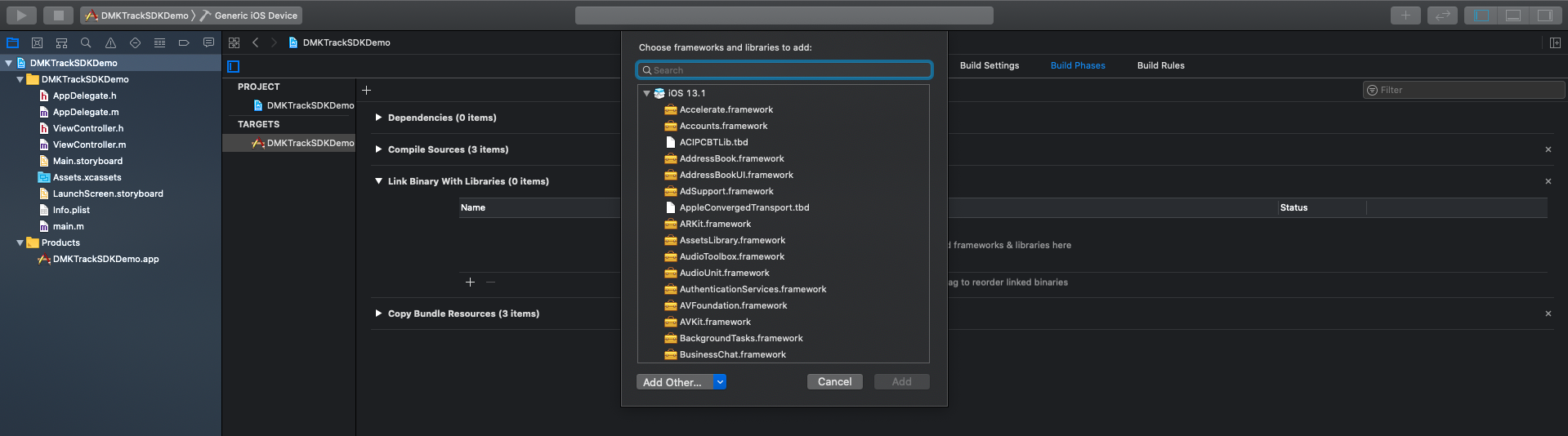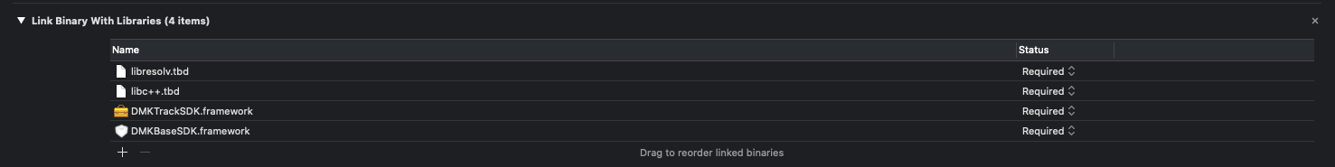 将解压后的 DMKBaseSDK.framework, DMKTrackSDK.framework 文件copy或拖拽到工程文件夹中,左侧目录选中工程名,在 TARGETS->Build Phases-> Link Binary With Libaries 中点击“+”按钮,在弹出的窗口中点击“Add Other”按钮,选择工程目录下的 DMKBaseSDK.framework, DMKTrackSDK.framework 文件添加到工程中。