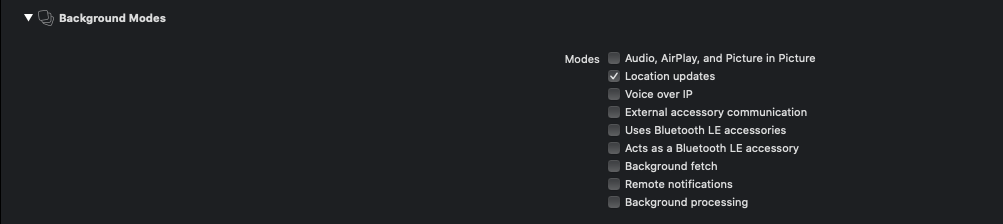 左侧目录中选中工程名,在TARGETS->Capabilities→Background Modes中选中Location updates.如下图: